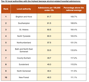 The analysis looked at hospital admissions for alcohol-specific conditions among under-18s across every local authority.